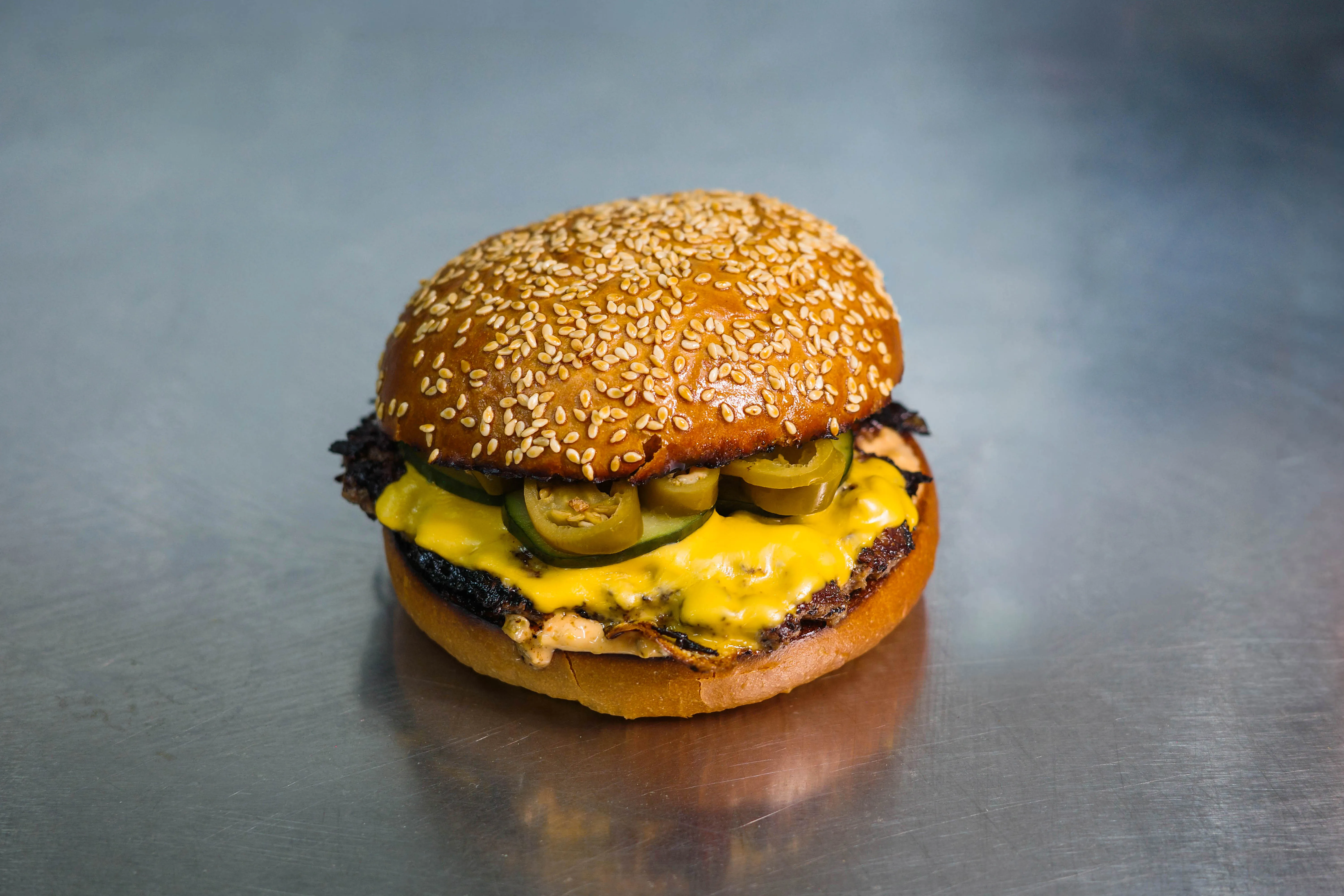 Smashed AUS wagyu patty, signature seasoning, grilled onions & jalapenos, double American cheese, spicy burger sauce, pickles, potato bun