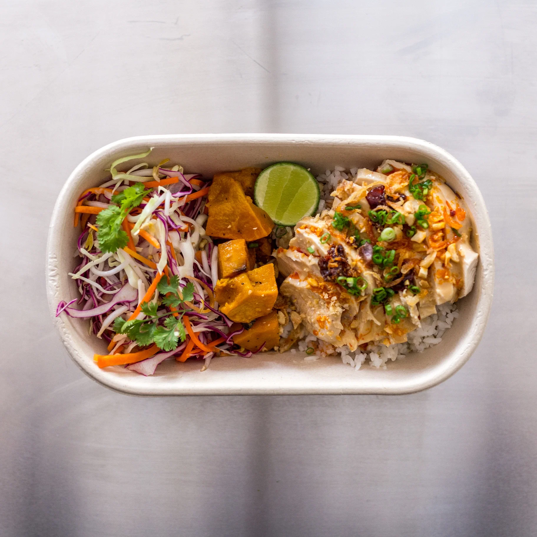 Garlic & ginger chicken meatballs, fragrant red curry sauce, sugar snap peas, shredded fresh veg, pickled carrot, lime dressing, crispy shallot, toasted sesame