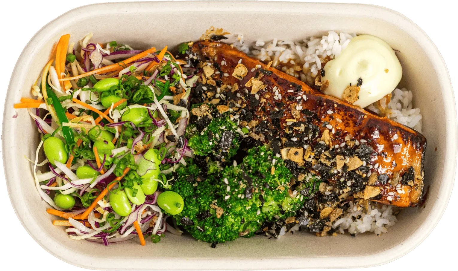 Pan roasted miso salmon, broccoli, edamame, shredded fresh veg, spring onion, ponzu dressing, wasabi mayonnaise, tamari almonds, furikake, lime